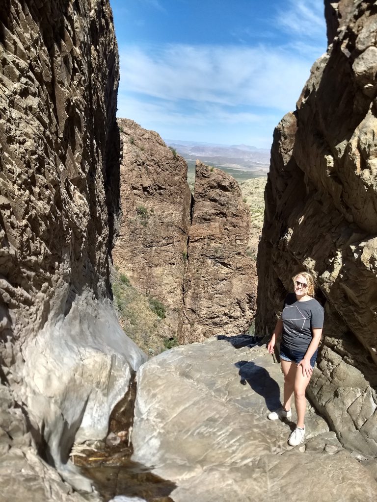 We hadden geleerd van gisteren en maakten een wandeling van vijf kilometer in de relatief koele bergen en we namen veel water en eten mee. Dat ging dus goed 😉. Een mooie hike naar het punt waar we gisteren de zon onder zagen gaan tussen de twee bergen. Er liep een beekje en op die plek veranderde dat in een hele hoge waterval waar je min of meer bovenop kon staan (maar niet te dicht, anders ging je behoorlijk dood).